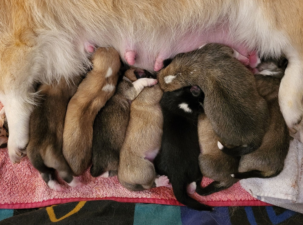 Gestern hat Gaga in einer Bilderbuchgeburt innerhalb von 4 Stunden 10 Welpen bekommen. Leider sind 2 tot zur Welt gekommen. Den verbliebenen 8 und Gaga geht es gut. Wir haben 5 Rüden und 3 Hündinnen. Ein Rüde ist tricolour, der Rest red-white. Alle Welpen sind vergeben.